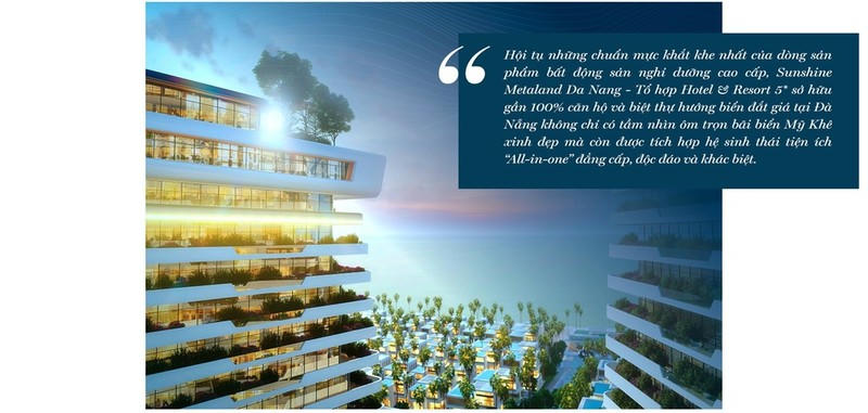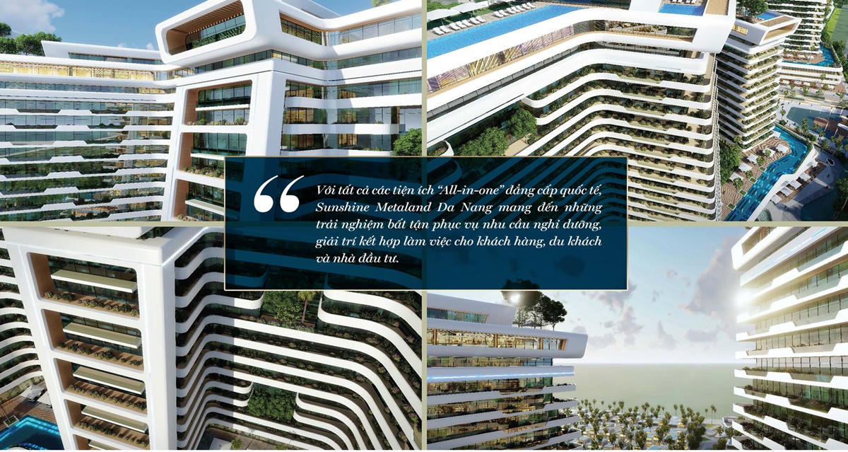 Nằm trong chuỗi dự án Sunshine Metaland - bất động sản nghỉ dưỡng và giải trí phức hợp tiên phong ứng dụng công nghệ “vũ trụ số” Metaverse, Sunshine Metaland Da Nang nâng tầm trải nghiệm người dùng cuối, hướng tới kết nối tương tác đa trải nghiệm trong kỷ nguyên công nghệ. Đặt trọng tâm là trải nghiệm số của khách hàng, Sunshine Metaland Da Nang mang tới những cảm xúc thật trong không gian ảo, để du khách thỏa sức sáng tạo, vui chơi theo những cách chưa từng có từ công nghệ 4.0, cá nhân hoá và làm thay đổi cách sống, nghỉ dưỡng và giải trí với những sáng tạo vượt trên mọi khuôn khổ.