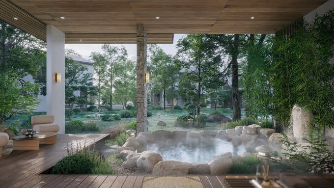 Tại dinh thự onsen, phiên bản giới hạn, bể khoáng ngoài trời có thể chứa 10 người cùng lúc. Trong khi đó, bên trong nhà, chủ đầu tư thiết kế với 5 phòng ngủ, cùng đa dạng các không gian chức năng như phòng khách, phòng ăn, phòng trà, thư phòng, phòng đa năng thích hợp cho gia đình đa thế hệ. Vườn Nhật rộng rãi xung quanh nhà cũng trở thành không gian sinh hoạt chung cho cả đại gia đình.