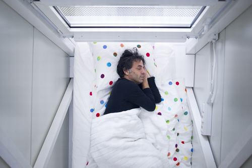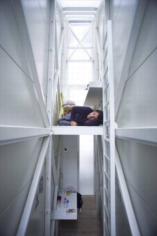 Bằng một chiếc thang nhỏ để lên tầng hai nơi đặt một chiếc giường có kích thước chỉ đủ cho một người nằm.