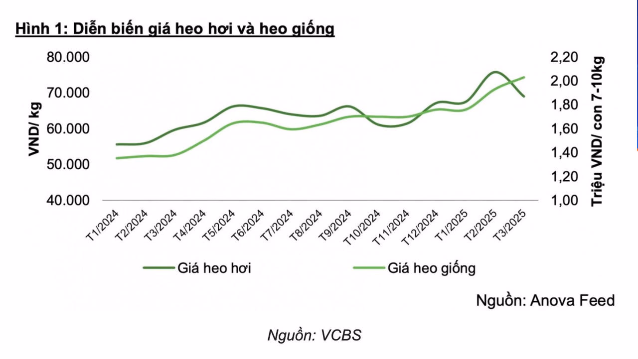 Giá heo tăng mạnh: VCBS đánh giá, giá heo sẽ tiếp tục duy trì ở mức cao, ít nhất trong nửa đầu năm 2025, với mức trung bình ước đạt 70.000 đồng/kg, tăng 18% so với cùng kỳ. Trong quý I, giá heo có lúc chạm mốc 80.000 đồng/kg, cao nhất trong vòng nhiều tháng. Nguyên nhân đến từ sự thiếu hụt nguồn cung sau dịch bệnh và quá trình xả đàn của hộ chăn nuôi.