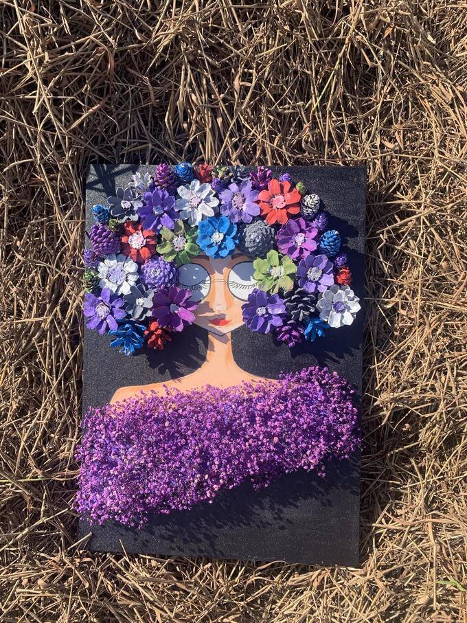 Biết tới chị Kiều Linh qua 1 bài viết ở nhóm "Flex tới hơi thở cuối cùng", tôi liên hệ để tìm hiểu thêm về đam mê vẽ tranh, làm tranh từ quả thông khô và cuộc sống hiện tại của chị.