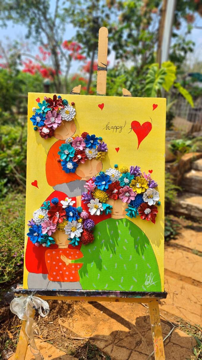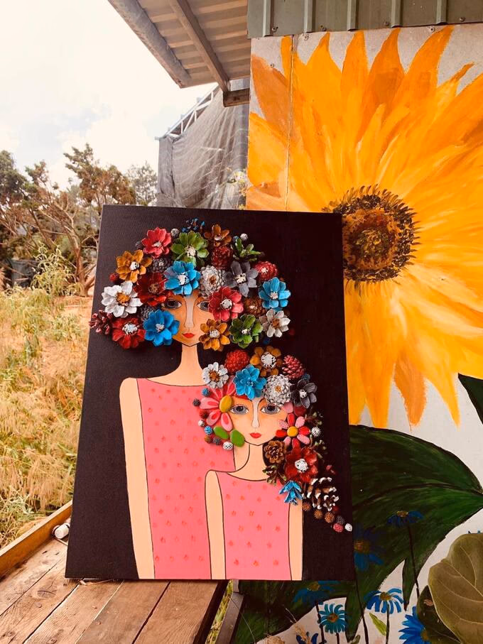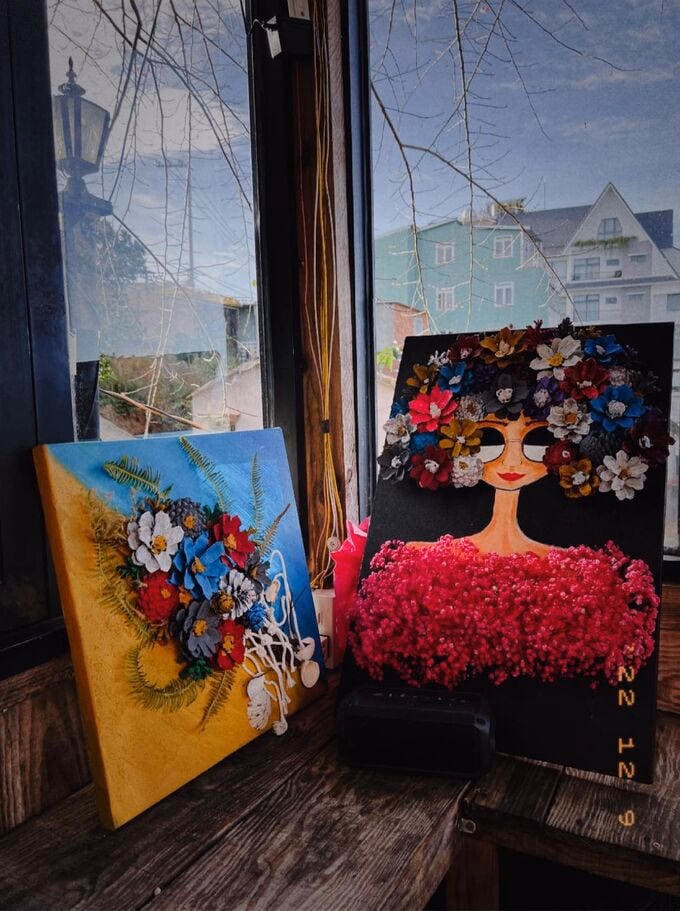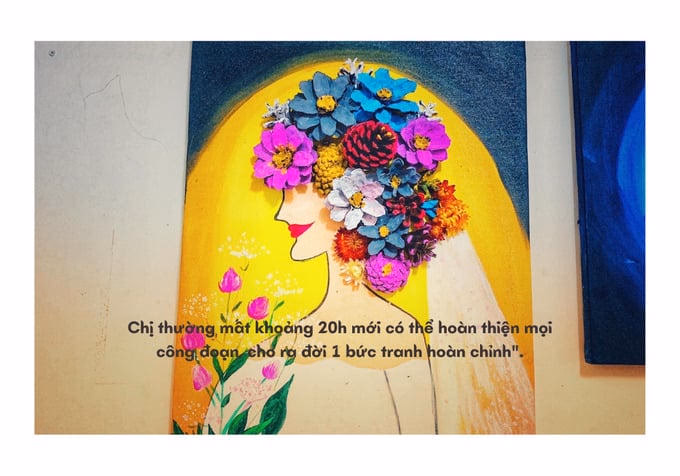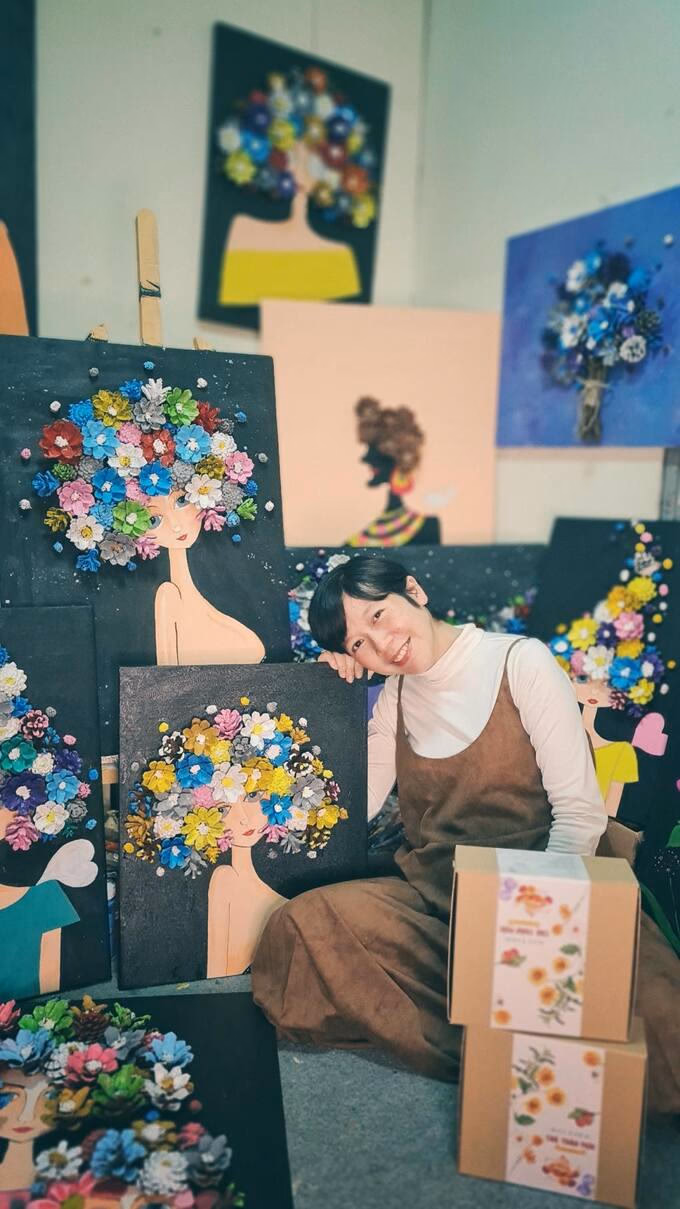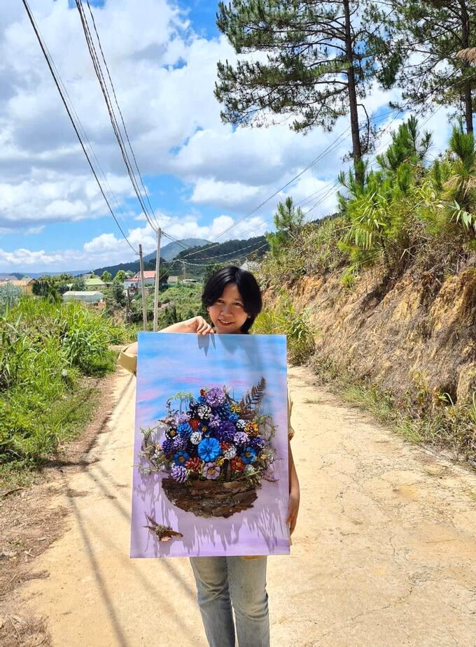 "Chị chuyển về Lâm Đồng sống từ đợt dịch Covid-19 hoành hành, tới nay cũng đã được 4 năm. Từ khi chuyển về đây, chị và chồng đã thuê đất, làm 1 cái farm nhỏ để trồng thảo mộc để làm trà, chuyên hoa cúc chi và hoa hồng. Trong khoảng thời gian này, chị mới vô tình bén duyên với việc vẽ tranh, tính tới nay được khoảng 2 năm thôi.