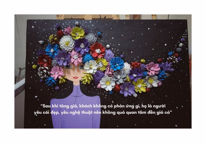 Bản thân chị nghĩ các sản phẩm handmade cũng xứng đáng có mức giá tốt hơn vì chúng ta sẽ mất nhiều công sức hơn sản xuất các sản phẩm khác. Thậm chí, khách hàng của chị còn phải chờ 1 thời gian dài mới nhận được tranh nhưng họ vẫn vui vẻ. Chị cần rất nhiều cảm xúc khi vẽ tranh, không phải lúc nào cũng có thể chạy đua với thời gian để sản xuất tranh ồ ạt. Khách hàng hiểu điều ấy nên họ cho chị nhiều thời gian hơn. Có người thậm chí còn đặt 10 bức tranh của chị cùng 1 lúc để trang trí trong ngôi nhà mới".