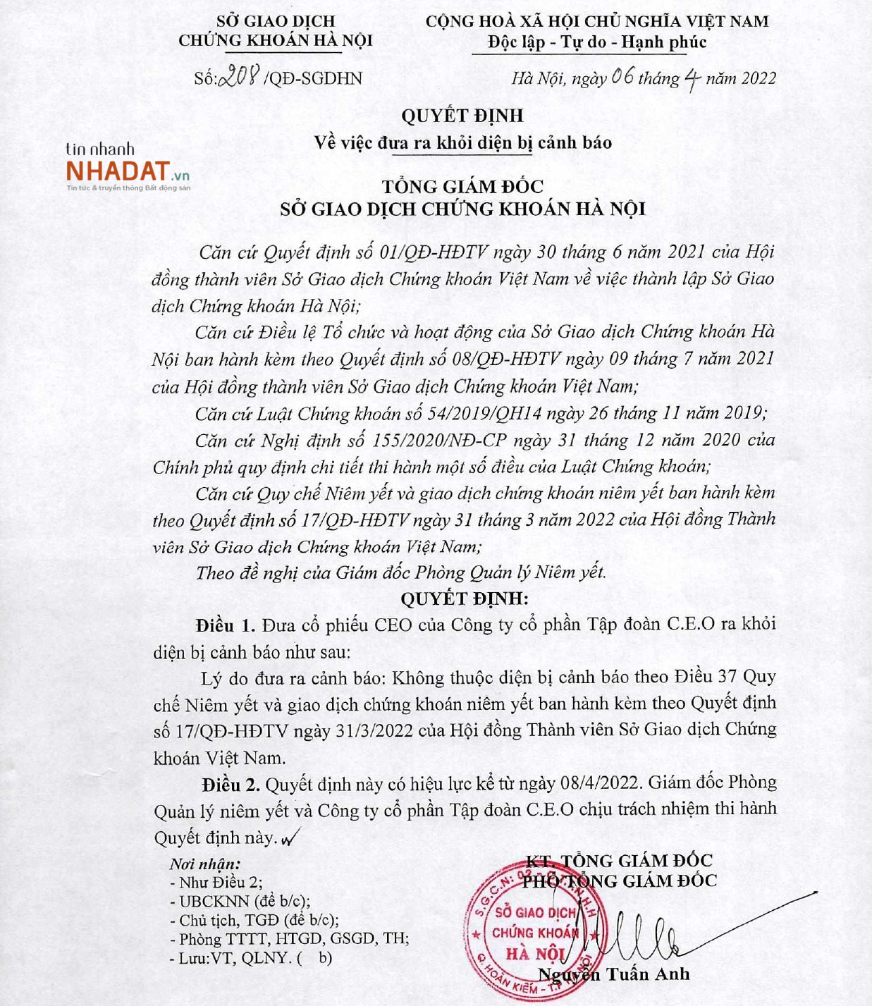Trước đó, HNX đưa cổ phiếu CEO vào diện cảnh báo là do lợi nhuận sau thuế của công ty mẹ năm 2020 trên Báo cáo tài chính hợp nhất năm 2020 của Công ty cồ phần Tập đoàn C.E.O (CEO Group) do Công ty TNHH Kiểm toán và Định giá Việt Nam ký báo cáo kiểm toán ngày 9/4/2021 là số âm, thuộc trường hợp bị cảnh báo theo quy định tại điểm 1.4 khoản 1 Điều 13 Quy chế niêm yết.