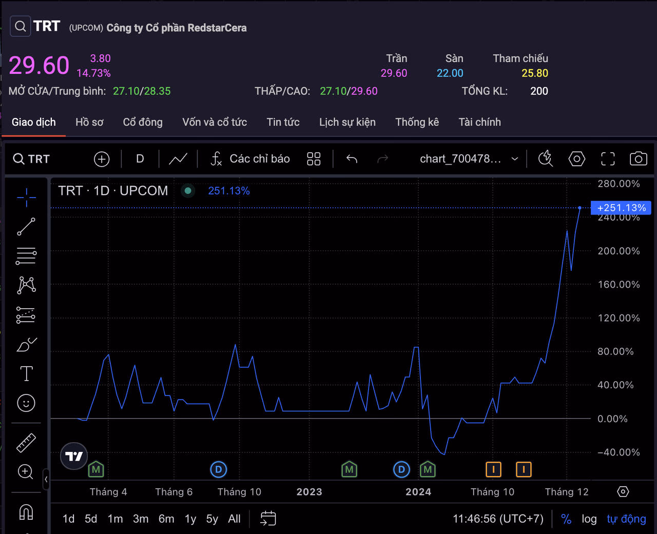 Kể từ khi VNSteel công bố kế hoạch thoái vốn, cổ phiếu TRT đã ghi nhận nhiều phiên tăng trần, đặc biệt là chuỗi ngày từ ngày 27/11 đến 3/12. Với biên độ dao động 15%, chuỗi 4 phiên tăng trần liên tiếp đã giúp cổ phiếu TRT bứt tốc trên thị trường chứng khoán, tăng gần 74%.
