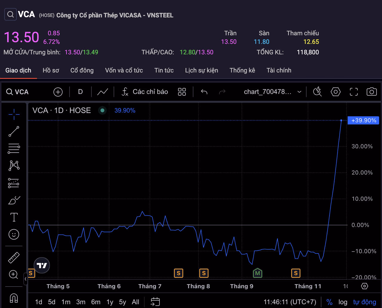 Thị giá của VCA tăng tương ứng từ mức 8.500 đồng/cổ phiếu (giá mở cửa phiên 28/11) lên mức 11.850 đồng/cổ phiếu (giá đóng cửa phiên 4/12). Sau 5 phiên tăng trần này, cổ phiếu VCA chưa hạ nhiệt mà tiếp tục ghi nhận thêm 1 phiên tăng trần nữa. Trong phiên sáng nay (6/12), VCA vẫn trên đà phi mã, cổ phiếu hiện đang giao dịch ở mức 13.500 đồng/cổ phiếu.