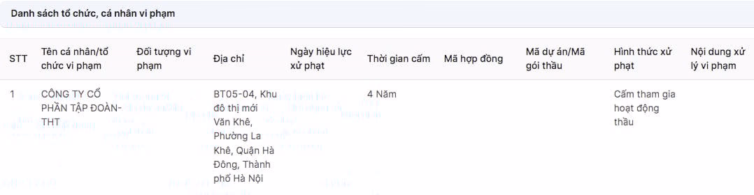 Công ty cổ phần Tập đoàn THT cung cấp thông tin trong hồ sơ đăng ký thực hiện dự án Đầu tư xây dựng Khu dân cư mới xã Minh Đức, huyện Tứ Kỳ, tỉnh Hải Dương không trung thực, dẫn tới bị cấm thầu trong thời gian 4 năm.