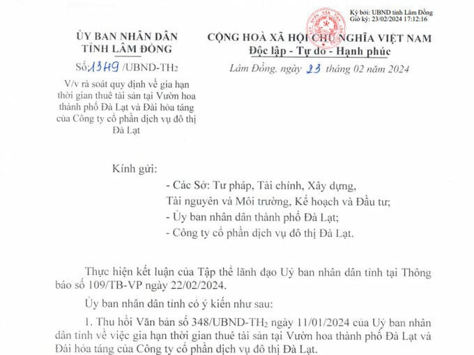 UBND tỉnh Lâm Đồng đã ban hành văn bản số 1349/UBND-TH2 để thu hồi văn bản số 348/UBND-TH2 của tỉnh về việc gia hạn thời gian thuê tài sản tại vườn hoa TP. Đà Lạt đối với CTCP Dịch vụ đô thị Đà Lạt (CTCP DVĐT Đà Lạt).