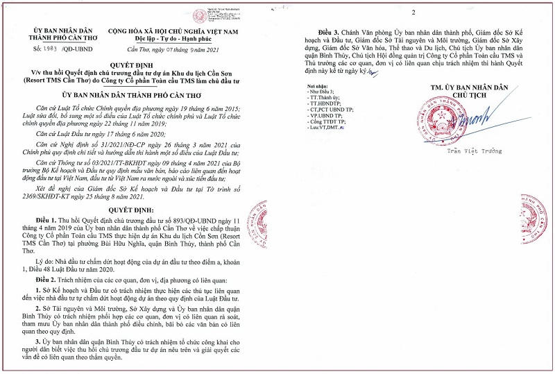 Mới đây, UBND TP Cần Thơ vừa ra Quyết định thu hồi Quyết định chủ trương đầu tư số 893/QĐ-UBND ngày 11/4/2019 về việc chấp thuận CTCP Toàn cầu TMS (TMS Group) thực hiện dự án Khu du lịch Cồn Sơn (Resort TMS Cần Thơ) tại phường Bùi Hữu Nghĩa, quận Bình Thủy, thành phố Cần Thơ.