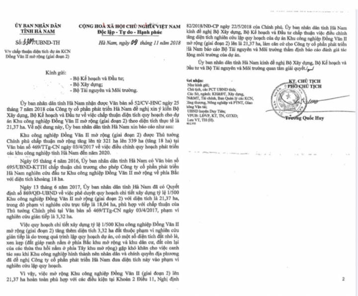 Để có cơ sở pháp lý về diện tích đất chênh lệch này, ngày 25/7/2018 Công ty Hà Nam có văn bản số 52/CV-HNC đề nghị UBND tỉnh Hà Nam xin ý kiến Bộ Xây dựng, Bộ KH&ĐT, Bộ TN&MT về chấp nhận diện tích mở rộng KCN Đồng Văn II giai đoạn 2 theo diện tích thực tế là 21,37ha. Theo đó, ngày 9/11/2018 UBND tỉnh Hà Nam có Văn bản số 3304/UBND-TH gửi Bộ KH&ĐT, Bộ Xây dựng, Bộ TN&MT về việc Chấp nhận diện tích mở rộng KCN Đồng Văn II giai đoạn 2.