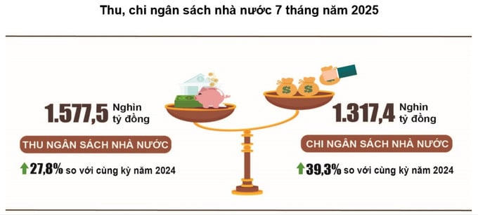 Theo Cục Thống kê, tổng thu ngân sách nhà nước 7 tháng năm 2025 ước đạt 1.577,5 nghìn tỷ đồng, bằng 80,2% dự toán năm và tăng 27,8% so với cùng kỳ năm trước.