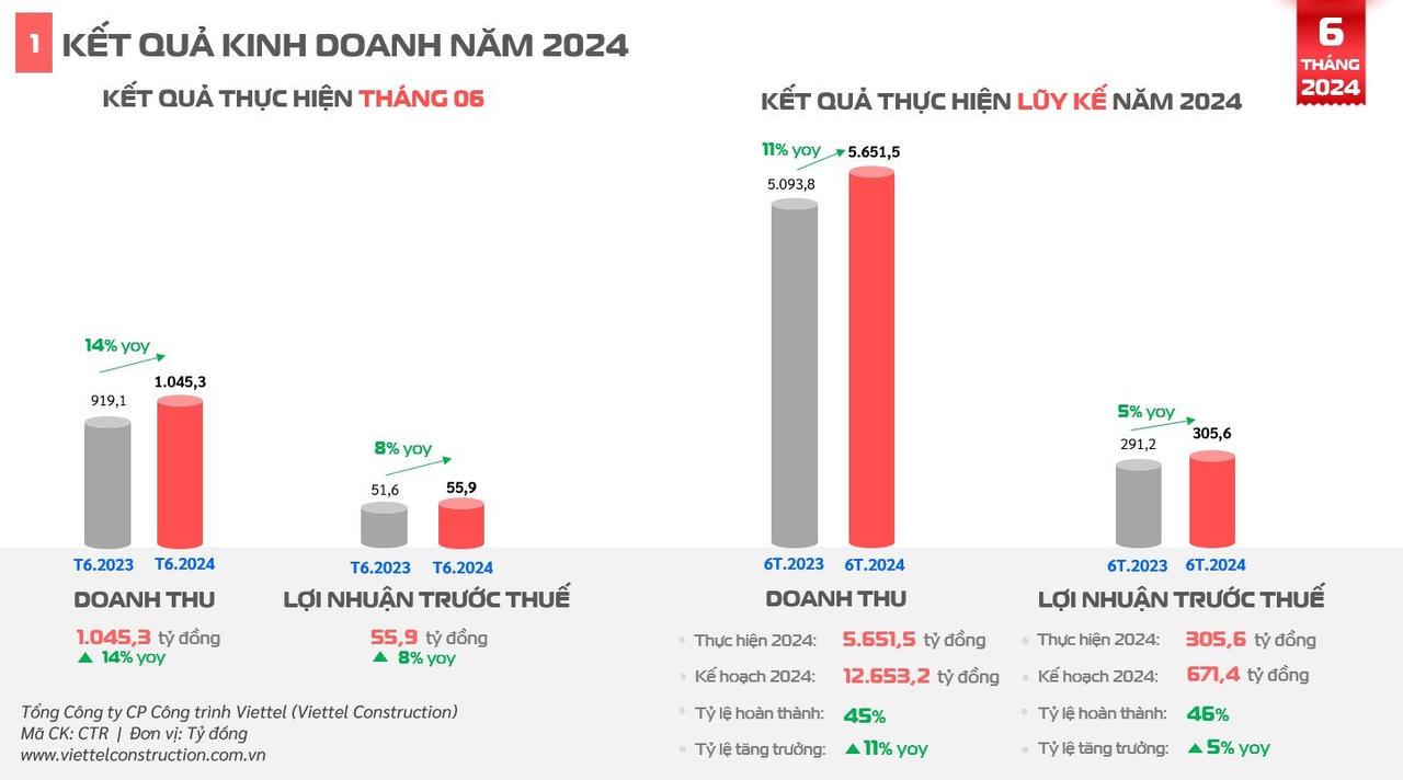 Theo kết quả kinh doanh công bố trong ngày 12/7, doanh thu tháng 6 của Viettel Construction đạt 1.045,3 tỷ đồng, tăng trưởng 14% so với cùng kỳ 2023; lợi nhuận trước thuế: đạt 55,9 tỷ đồng, tăng trưởng 8% so với cùng kỳ.