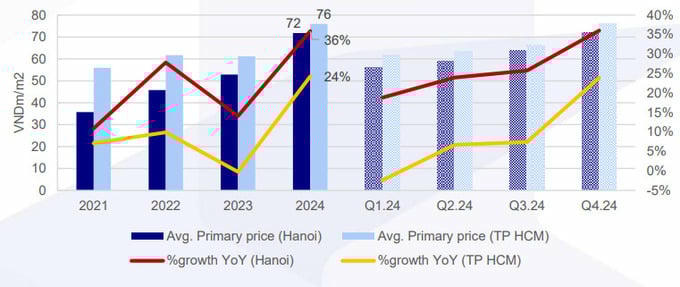 Còn theo số liệu của đơn vị tư vấn bất động sản Savills, năm 2024, tổng nguồn cung căn hộ mới đạt 24.996 căn, cao nhất kể từ năm 2020. Riêng nguồn cung mới trong quý IV đạt 12.972 căn, tăng mạnh 146% theo quý và 351% theo năm. Nguồn cung sơ cấp đạt 16.629 căn, tăng 58% theo quý và 40% theo năm.