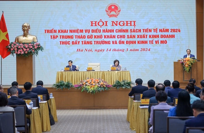 Sáng nay (14/3) đã diễn ra Hội nghị triển khai nhiệm vụ điều hành chính sách tiền tệ năm 2024, tại đây, Thủ tướng Chính phủ cùng Thống đốc Ngân hàng Nhà nước, nhiều Bộ trưởng đã họp bàn cùng chủ tịch Hội đồng thành viên, HĐQT và Tổng giám đốc các doanh nghiệp sẽ cùng thảo luận vấn đề liên quan đến tháo gỡ khó khăn cho sản xuất kinh doanh, thúc đẩy tăng trưởng và ổn định kinh tế vĩ mô.