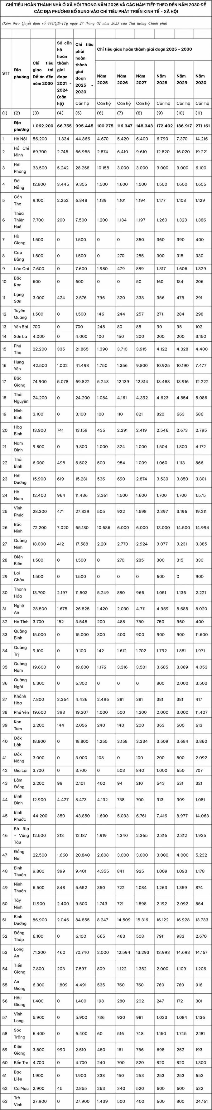 Theo đó, chỉ tiêu nhà ở xã hội các địa phương phải hoàn thành giai đoạn 2025 - 2030 là 995.445 căn hộ.