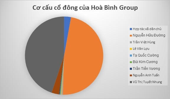 Cơ cấu cổ đông của Hòa Bình Group còn 8 thành viên khác, bao gồm 1 pháp nhân và 7 thể nhân. Trong đó ông Nguyễn Hữu Đường góp 524,48 tỷ đồng, sở hữu 47,68% vốn điều lệ, bà Vũ Thị Tuyết Nhung với phần vốn góp trị giá 493,02 tỷ đồng, tương đương tỷ lệ sở hữu 44,82% vốn điều lệ.