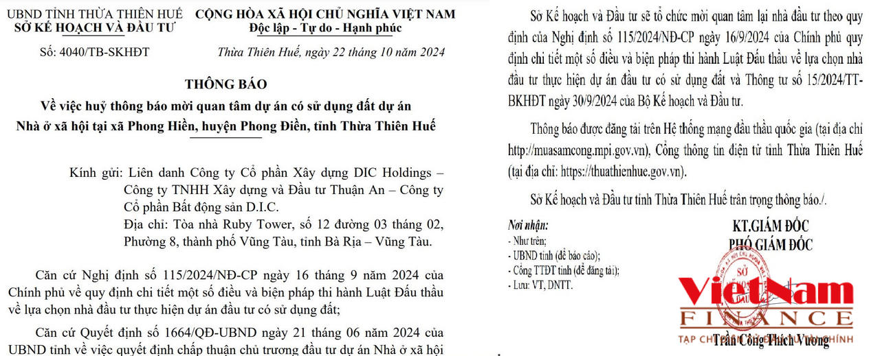 Theo đó, Sở Kế hoạch và Đầu tư tỉnh Thừa Thiên Huế đã có thông báo về việc huỷ thông báo mời quan tâm dự án có sử dụng đất dự án Nhà ở xã hội (NƠXH) tại xã Phong Hiền, huyện Phong Điền, tỉnh Thừa Thiên Huế và dự án Nhà ở xã hội tại Khu đất XH1 thuộc Khu B - Đô thị mới An Vân Dương, TP. Huế.