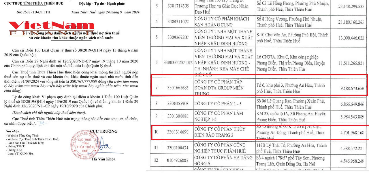 Tiếp đó, ngày 4/9/2024, Cục trưởng Cục thuế Thừa Thiên Huế Hà Văn Khoa đã ký quyết định số 1470 QĐ-CCTHT về việc cưỡng chế thi hành quyết định hành chính về quản lý thuế bằng biện pháp ngừng sử dụng hoá đơn đối với Công ty Cổ phần Thuỷ điện Rào Trăng 4. Số tiền bị cưỡng chế hơn 2,5 tỷ đồng.