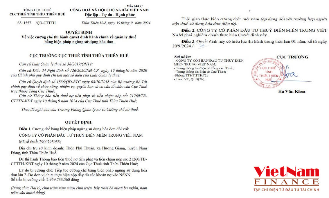 Ngày 19/9/2024, Cục trưởng Cục thuế Thừa Thiên Huế cũng ra quyết định số 1557QĐ-CCTHT về việc cưỡng chế thi hành quyết định hành chính về quản lý thuế bằng biện pháp ngừng sử dụng hoá đơn đối với Công ty Cổ phần Thuỷ điện Miền Trung Việt Nam. Số tiền bị cưỡng chế hơn 2,9 tỷ đồng…