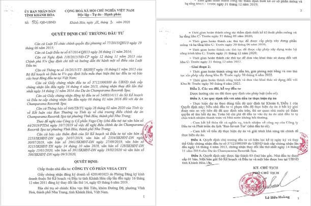 Sau nhiều biến động về điều chỉnh quy hoạch, đổi chủ… đến ngày 12/3/2020, UBND tỉnh Khánh Hòa ra văn bản số 506/QĐ-UBND Quyết định chủ trương đầu tư, chấp thuận Công ty cổ phần Vega City làm chủ đầu tư dự án này. Đồng thời điều chỉnh lại tiến độ dự án.