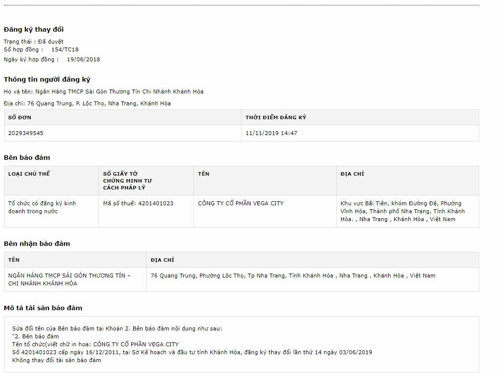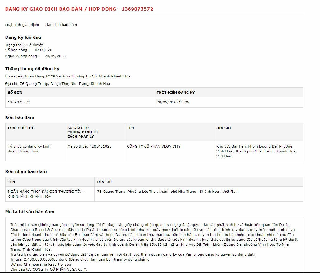 Đến tháng 5/2020 Công ty Cổ phần Vega City tiếp tục thế chấp dự án Vega City Nha Trang tại ngân hàng TMCP Sài Gòn Thương Tín - chi nhánh Khánh Hòa cho khoản vay 2.400 tỷ đồng