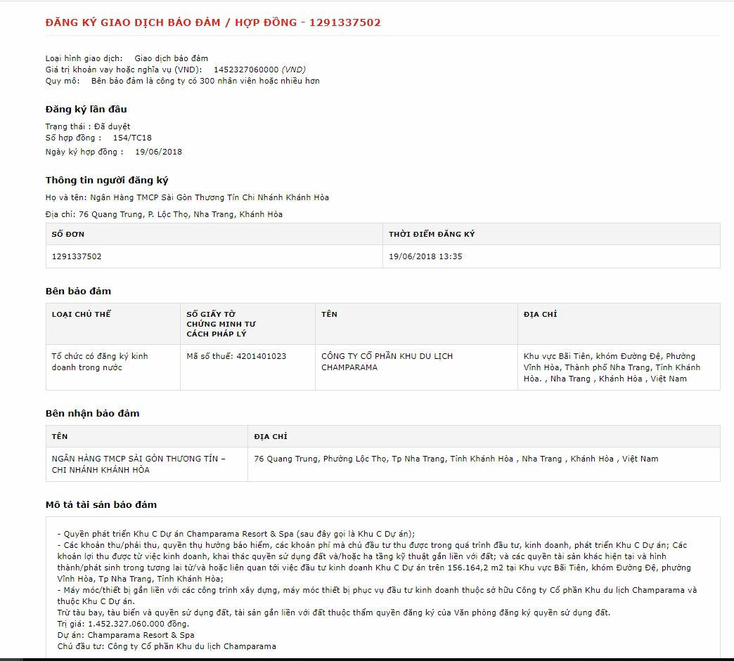 Cụ thể, tài sản đảm bảo gồm toàn bộ tài sản (không bao gồm quyền sử dụng đất đã được cấp giấy chứng nhận quyền sử dụng đất), quyền tài sản phát sinh liên quan đến dự áán Champarama Resort & Spa.