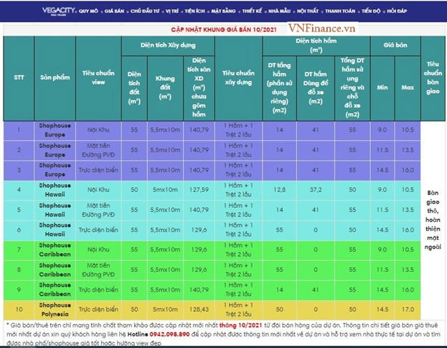 Hiện các sản phẩm bất động sản tại Vega City Nha Trang đang được rao bán rầm rộ trên thị trường. Theo các thông tin quảng cáo, sản phẩm shophouse tại đây có giá bán dao động từ 9 – 15 tỷ đồng. Cụ thể, shophouse view mặt biển có mức giá trung bình 15 tỷ; shophouse view mặt đường Phạm Văn Đồng có mức giá trung bình 12,5 tỷ; shophouse view nội khu có mức giá trung bình 9 tỷ.