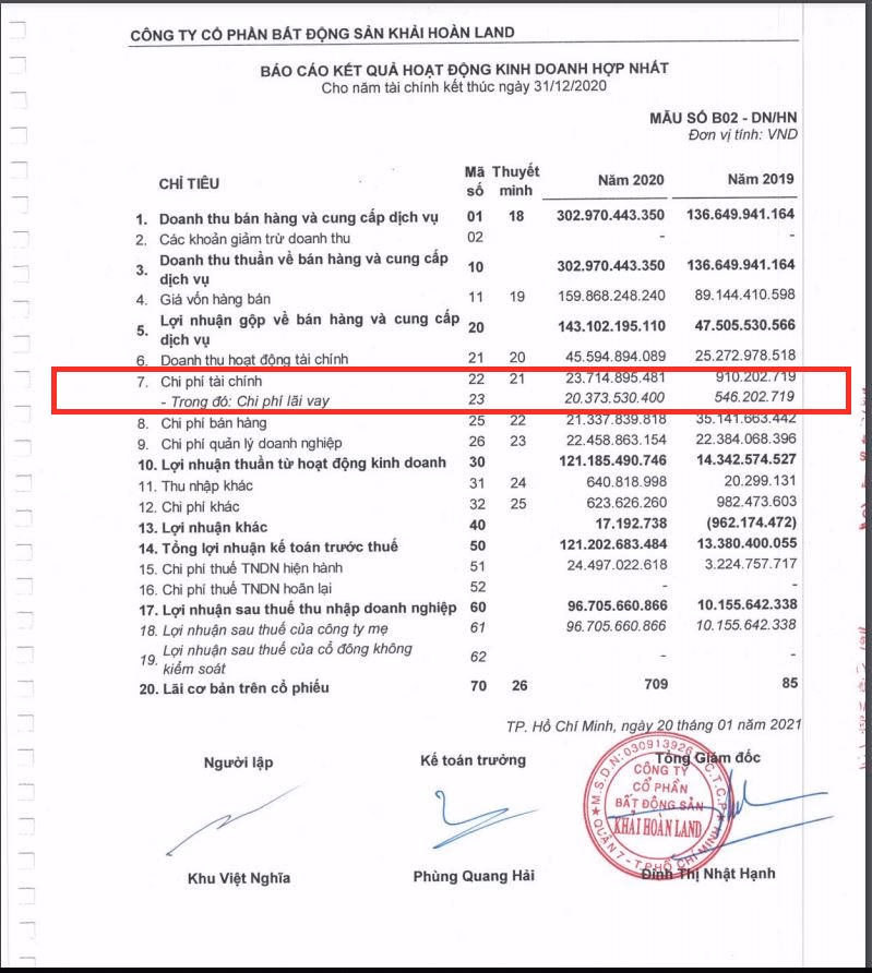 Theo BCTC hợp nhất năm 2020 của Khải Hoàn Land, doanh thu đạt gần 303 tỷ đồng và lãi ròng 97 tỷ đồng, tăng trưởng đáng kể so với kết quả năm 2019. Tuy nhiên, BCTC của doanh nghiệp cũng cho thấy xu hướng tăng mạnh vay nợ và chi phí tài chính.