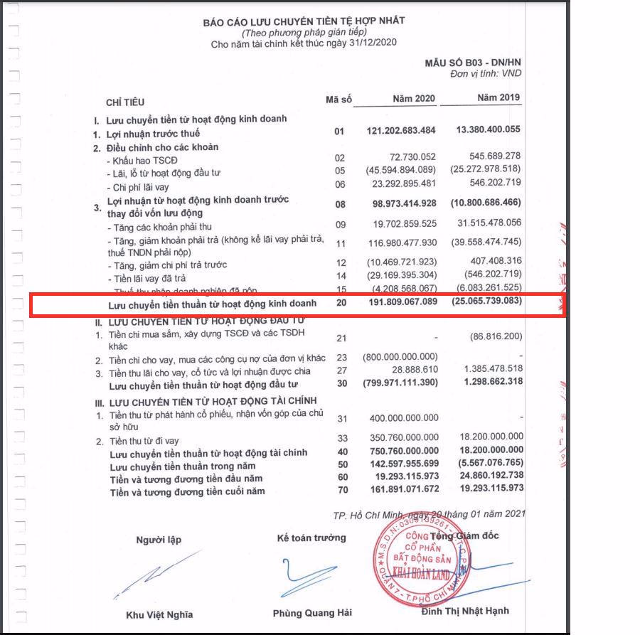 Báo cáo lưu chuyển tiền của Khải Hoàn Land cho thấy, công ty thiếu hụt dòng tiền thuần từ hoạt động kinh doanh, ghi nhận âm 25 tỷ đồng vào năm 2019. Để bù đắp nguồn tiền chi trả và duy trì hoạt động, năm vừa qua Khải Hoàn Land đã liên tục huy động vốn qua kênh trái phiếu.