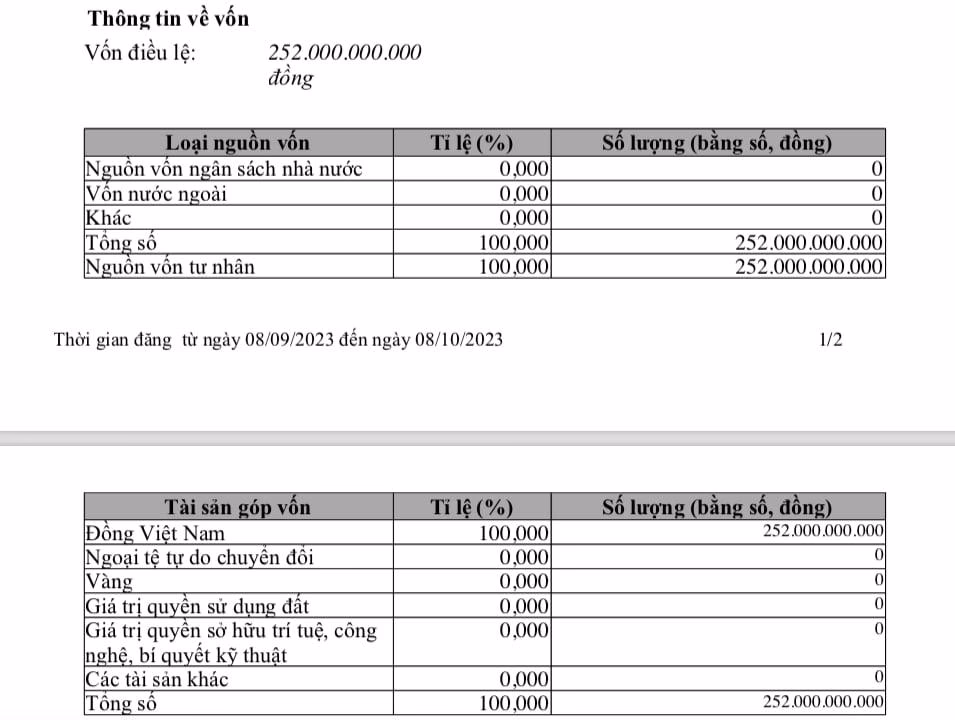 Người đại diện theo pháp luật là Trần Cao Cường, sinh năm 1979, chức vụ Giám đốc. Vốn điều lệ 252 tỷ đồng. Đến tháng 9/2023, công ty nâng vốn điều lệ lên 338 tỷ đồng.