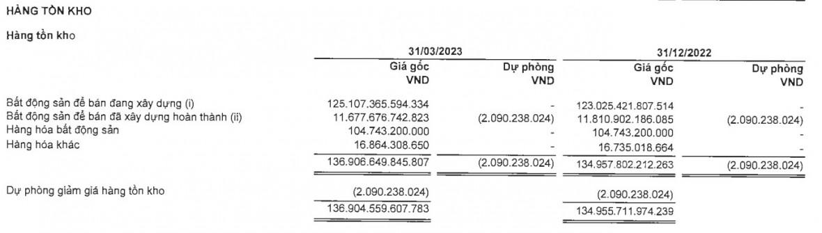 Hay như CTCP Tập đoàn Đất Xanh (mã CK: DXG) ghi nhận 15.114 tỷ đồng hàng tồn kho tính đến cuối quý I/2023, chiếm 49,6% tổng tài sản và tăng 6,2% so với cuối năm ngoái, tăng 32,4% so với cùng kỳ. Trong đó, hàng tồn kho chủ yếu nằm ở bất động sản dở dang chiếm 12.888 tỷ đồng, tương đương và bất động sản thành phẩm là 1.590 tỷ đồng.