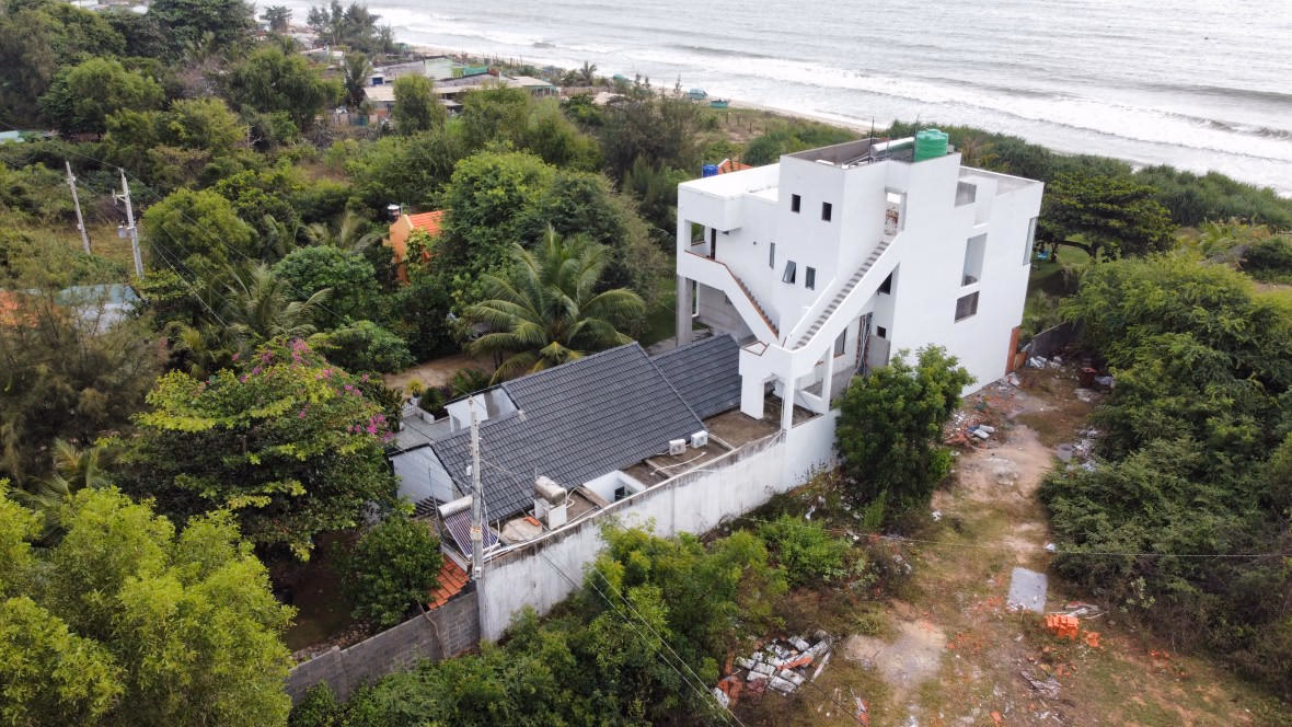 Thế nhưng, ngay giữa khu vực này lại có 1 căn biệt thự hoành tráng, được xây dựng 3 tầng cùng với khuôn viên rộng rãi lên tới hơn trăm m2. Ngoài cổng đề biển hiệu: Phan Thiet Beach house; Lotus Beach house; Coco Beach house.