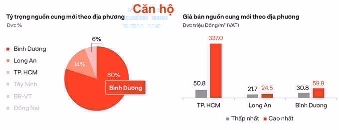 Tại phân khúc căn hộ, nguồn cung mới tăng mạnh, gấp 3,8 lần so với tháng trước và gấp 2,8 lần so với cùng kỳ năm 2023. Nguồn cung căn hộ mới tập trung tại Bình Dương, Long An và TP.HCM. Trong đó, Bình Dương chiếm 80% nguồn cung mới và chiếm 71% tổng lượng tiêu thụ mới tại khu vực.