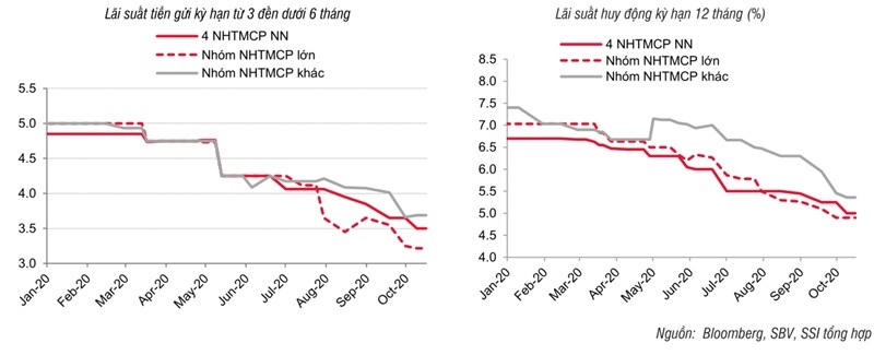 Theo SSI Research, lãi suất tiền gửi đang dao động ở mức 3 đến 3,8%/năm với kì hạn dưới 6 tháng, 3,7 đến 5%/năm với kì hạn 6 đến dưới 12 tháng, 4,9 đến 5,8%/năm với kì hạn 12,13 tháng.