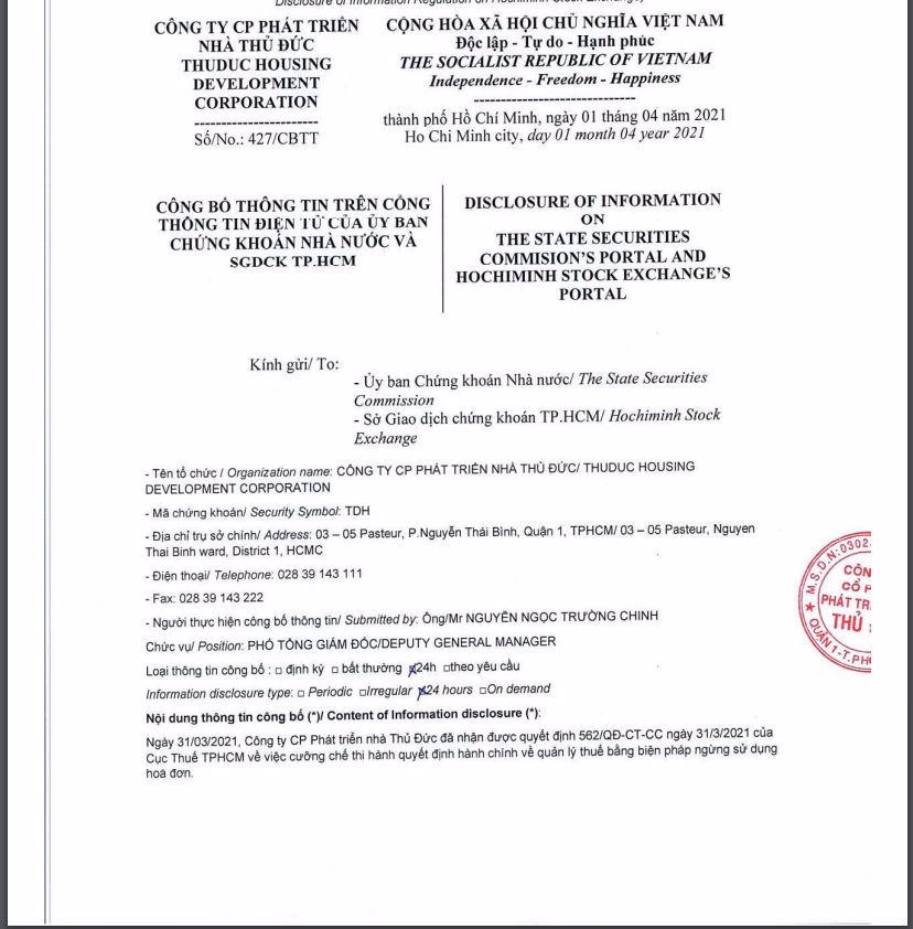 Cục Thuế TP. Hồ Chí Minh vừa ban hành quyết định cưỡng chế bằng biện pháp ngừng sử dụng hóa đơn của Công ty cổ phần Phát triển nhà Thủ Đức (Thuduc House- mã CK: TDH). Quyết định có hiệu lực thi hành trong thời gian một năm, kể từ ngày 31/3/2021 đến ngày 30/3/2022.
