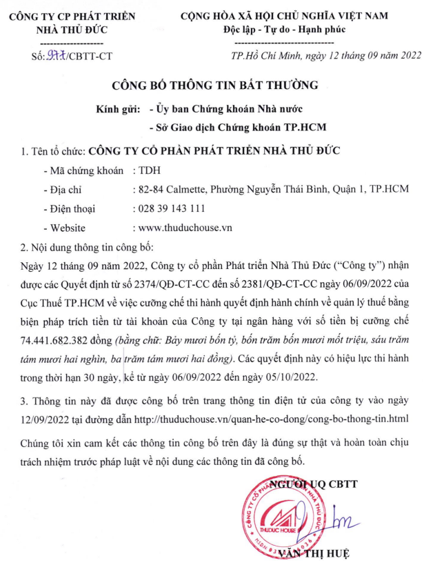 CTCP Phát triển Nhà Thủ Đức (TDH) công bố về thông tin Cục thuế TPHCM sẽ cưỡng chế thi hành quyết định hành chính về quản lý thuế đối với TDH bằng cách trích tiền từ tài khoản của Công ty tại ngân hàng hơn 74 tỷ đồng từ ngày 6/9-5/10/2022.