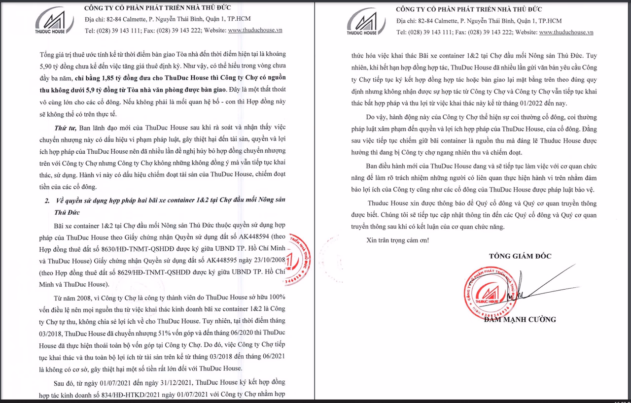 Sau đó, từ ngày 1/7/2021 đến ngày 31/12/2021, Thuduc House ký kết hợp đồng hợp tác kinh doanh ngày 1/7/2021 với Công ty Chợ nhằm hợp thức hoá việc khai thác bãi xe container 1&2 tại Chợ đầu mối Nông sản Thủ Đức. Tuy nhiên, khi hết hạn hợp đồng hợp tác, Thuduc House đã nhiều lần gửi văn bản yêu cầu Công ty Chợ tiếp tục ký kết hợp đồng hợp tác hoặc bàn giao lại mặt bằng theo đúng quy định nhưng không nhận được sự hợp tác từ Công ty Chợ và Công ty Chợ vẫn tiếp tục khai thác bất hợp pháp và thu lợi từ việc khai thác này kể từ tháng 1/2022 đến nay.