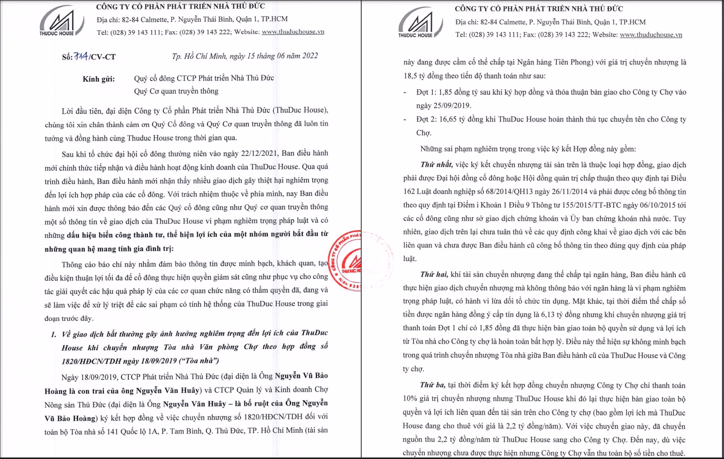 Cụ thể, đó là giao dịch bất thường gây ảnh hưởng nghiệm trọng đến lợi ích của Thuduc House khi chuyển nhượng tòa nhà văn phòng Chợ theo hợp đồng số 1820 ngày 18/9/2019.