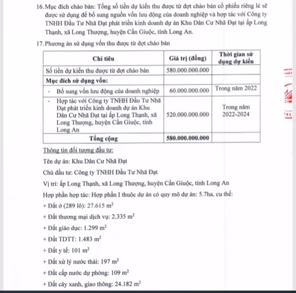 Đáng chú ý, phương án sử dụng vốn này này được điều chỉnh từ phương án phát hành cũ là chào bán 120 triệu cổ phiếu với giá 12.000 đồng/cp, dự thu 1.440 tỷ đồng và rót vào dự án Khu dân cư Đông Trung tại xã Bình Hòa, Thuận An, Bình Dương do CTCP Bất động sản Đông Trung làm chủ đầu tư. Dự án có diện tích 4,61 ha, tổng vốn đầu tư 4.585 tỷ đồng. Sau khi triển khai, dự kiến đem về doanh thu 7.119 tỷ đồng, lợi nhuận sau thuế 1.686 tỷ đồng.