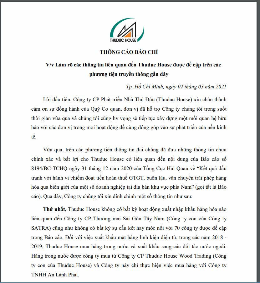 Thứ nhất, Thuduc House khẳng định Công ty không có bất kỳ hoạt động xuất nhập khẩu hàng hóa nào liên quan đến CTCP Thương mại Sài Gòn Tây Nam (công ty con của SATRA), cũng như không có bất kỳ sự cấu kết hay móc nối với 70 công ty được đề cập trong báo cáo.