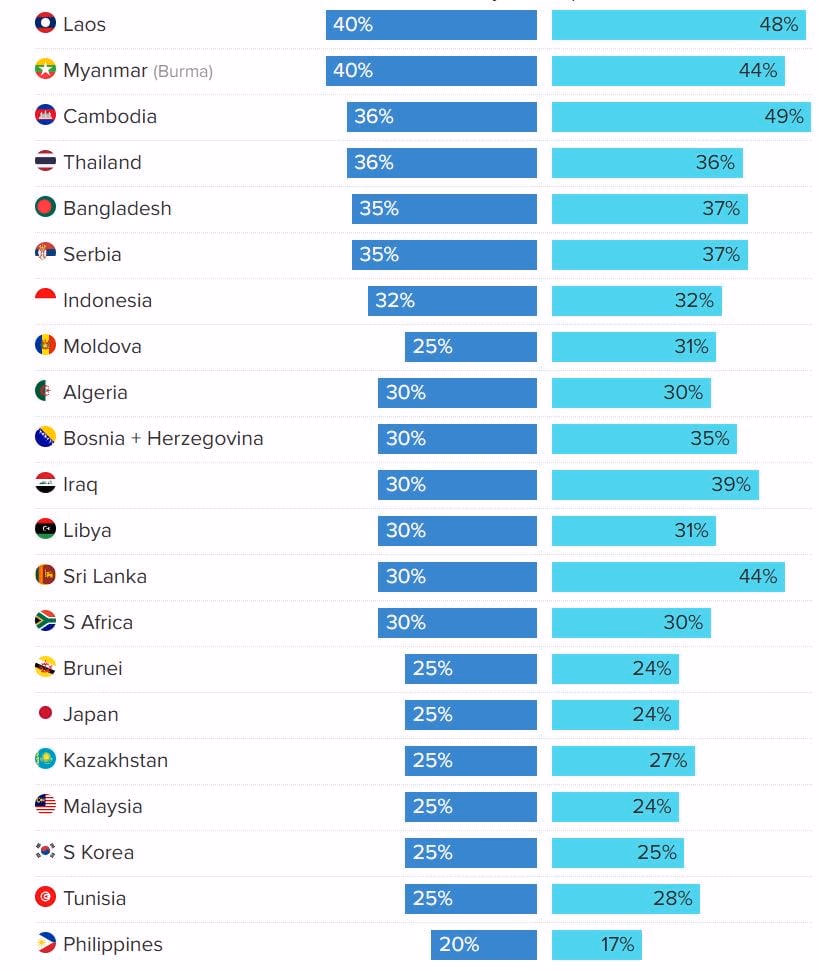 Mức thuế mới mà ông Trump tuyên bố đối với hàng hóa từ Sri Lanka, Moldova, Iraq và Libya thấp hơn mức công bố ban đầu hồi tháng 4. Ngược lại, thuế đối với hàng từ Philippines và Brunei đã được nâng lên, trong khi Algeria tiếp tục giữ mức 30% như cũ.