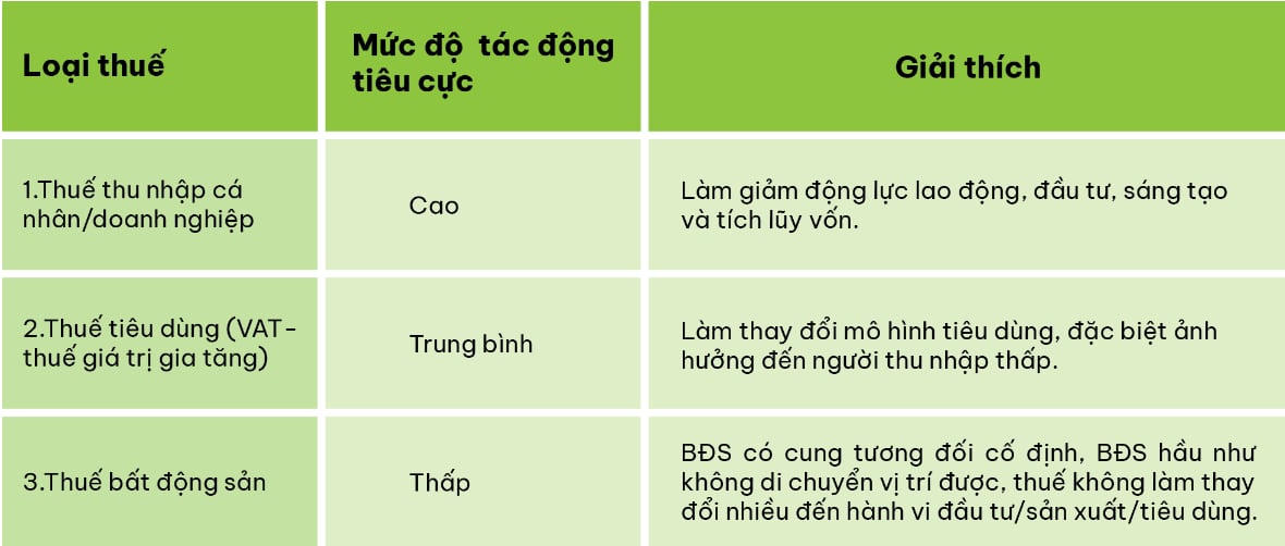 Hai là, thuế BĐS không làm giảm động lực lao động hay đầu tư thực so với các loại thuế khác như: thuế suất thuế thu nhập tăng có thể khiến cá nhân giảm làm việc hoặc trốn thuế, thuế suất VAT tăng đánh vào hàng tiêu dùng khiến người tiêu dùng trì hoãn hoặc giảm tiêu dùng.... Thuế BĐS không trực tiếp đánh vào dòng tiền, mà đánh vào giá trị tài sản sở hữu, giao dịch nên ít ảnh hưởng tới hành vi làm việc, tiết kiệm hay tiêu dùng.