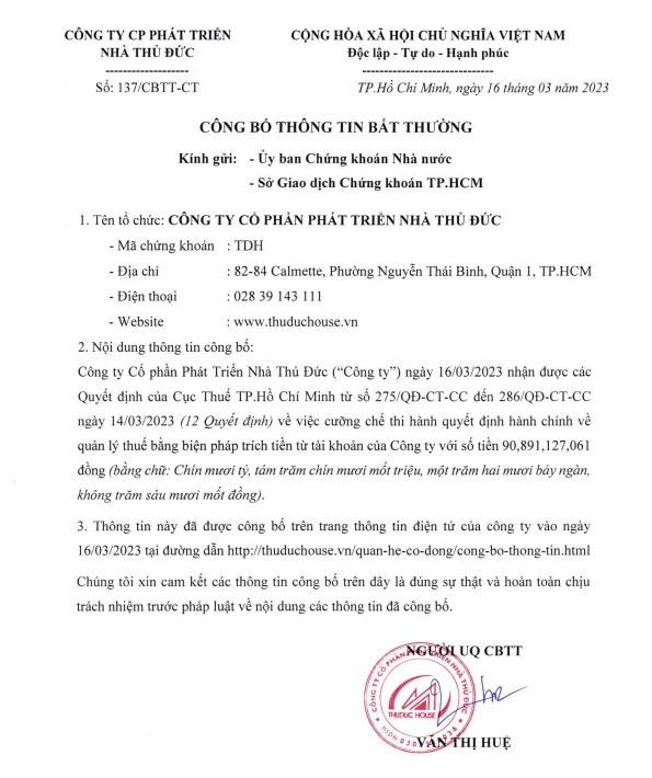 Theo công bố thông tin của CTCP Phát triển Nhà Thủ Đức (Thuduc House – Mã: TDH), ngày 16/03/2023 công ty đã nhận được 12 quyết định của Cục Thuế TP. Hồ Chí Minh về việc cưỡng chế thi hành quyết định hành chính về quản lý thuế bằng biện pháp trích tiền từ tài khoản với số tiền gần 91 tỷ đồng.