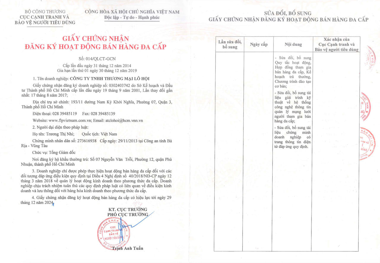 Đáng chú ý, theo thông tin Giấy chứng nhận đăng ký hoạt động bán hàng đa cấp số 014/QLCT-GCN được cấp lần đầu ngày 31/12/2014, gia hạn lần lần 01 ngày 30/12/2019 có quy định Giấy chứng nhận đăng ký hoạt động bán hàng đa cấp có hiệu lực tới ngày 29/12/2024.