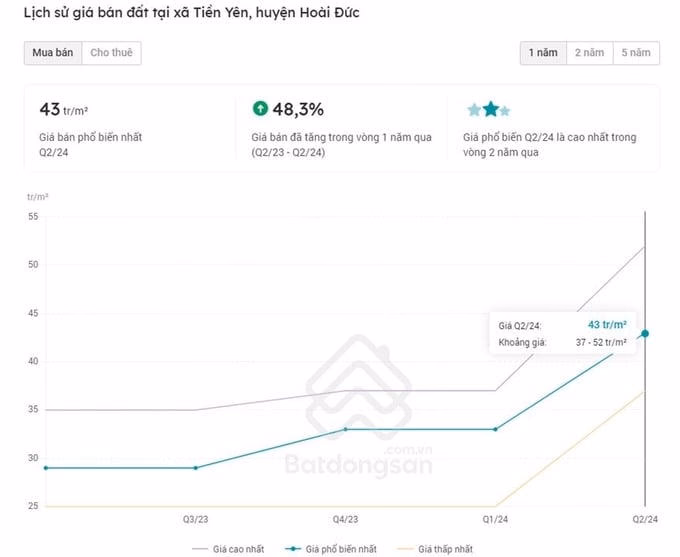 Theo thống kê của Batdongsan.com.vn, giá rao bán phổ biến đất nền trong quý II/2024 tại xã Tiền Yên, huyện Hoài Đức, TP. Hà Nội - nơi vừa diễn ra cuộc đấu giá với mức giá kỷ lục là 43 triệu đồng/m2. Trong vòng 1 năm, giá đất ở địa phương này đã tăng hơn 48% và giá đất trúng đấu giá trong phiên vừa qua đã cao gấp từ 2 đến 3 lần so với mặt bằng giá phổ biến.