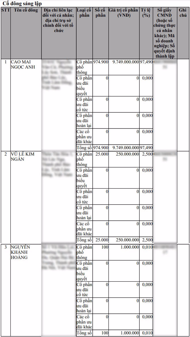 Thời điểm thành lập, Công ty cổ phần Nhà thuốc Phượng Hoàng đăng ký vốn điều lệ là 25 tỷ đồng. Cổ đông sáng lập gồm: Cao Mai Ngọc Anh góp gần 18 tỷ đồng, nắm giữ 71,99% cổ phần; Vũ Lê Kim Ngân góp 2,05 tỷ đồng, nắm giữ 8,2% cổ phần và Nguyễn Khánh Hoàng góp 2,5 triệu đồng, sở hữu 0,01%. Số cổ phần còn lại không được công bố.
