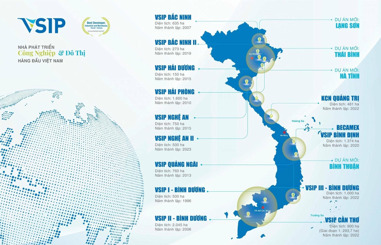 Đến nay, VSIP đã xây dựng được một hệ thống các khu công nghiệp tại 13 tỉnh thành trên cả nước, bao gồm các khu vực trọng điểm như Bình Dương, Bắc Ninh, Hải Phòng, Quảng Ngãi, Cần Thơ, và Nghệ An.
