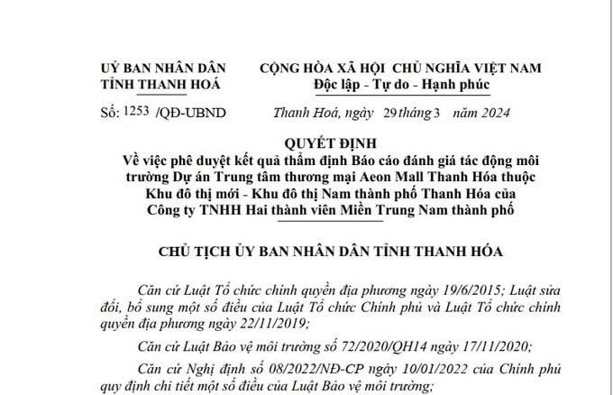 UBND tỉnh Thanh Hóa đã có quyết định việc phê duyệt kết quả thẩm định Báo cáo đánh giá tác động môi trường Dự án Trung tâm thương mại Aeon Mall Thanh Hóa.