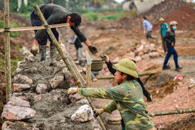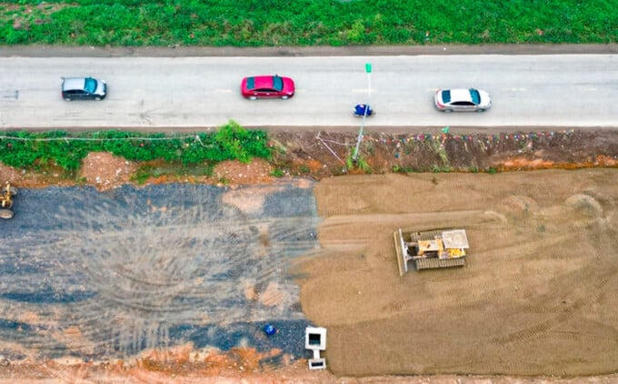 Tại đoạn đi qua Khu Công Nghiệp Phú Nghĩa, hiện mặt bằng đang được san lấp, công nhân được huy động xây kè dọc đường.
