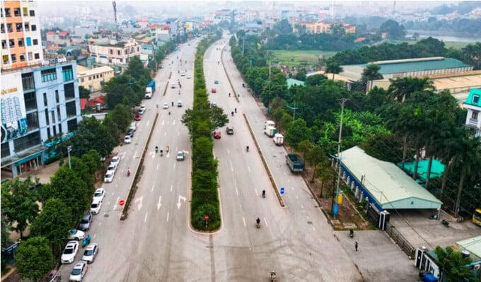 Hiện tuyến đường chỉ rộng 6-10m với 2-4 làn xe hỗn hợp. Sau khi mở rộng, đoạn đường sẽ có 8-10 làn đường, mặt cắt ngang 50-60m, tốc độ thiết kế 80-100km/h. Trong ảnh là một đoạn đường thuộc thị trấn Chúc Sơn đã hoàn thiện với 5 làn đường mỗi bên. Những đoạn còn lại cũng sẽ có hình dáng tương tự.